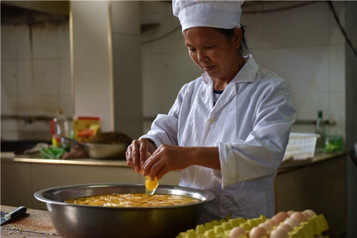厨师唐爱秀一边打鸡蛋一边说:“得为一个孩子准备一个蛋!”