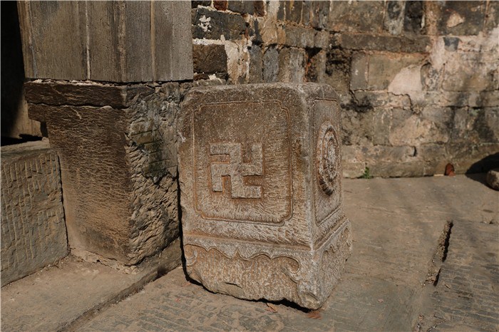 沿着青石板巷一路前行,又一处民居大门气势不凡,门头上书“毛主席万岁” ,门当处的几块石雕特别精致,历史在上面留下了厚厚的沉淀。特别是上面的“万字吉祥符” ,比较少见。