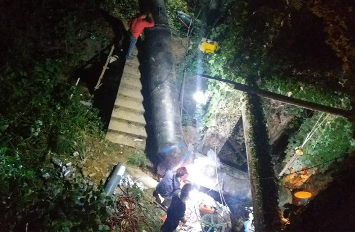 会同新闻网9月4日讯(记者 吴鹏 黄会军 )9月1日晚上10点半,记者在会同大桥附近自来水取水点看到,县自来水公司正组织施工人员紧张进行新输水管铺设。