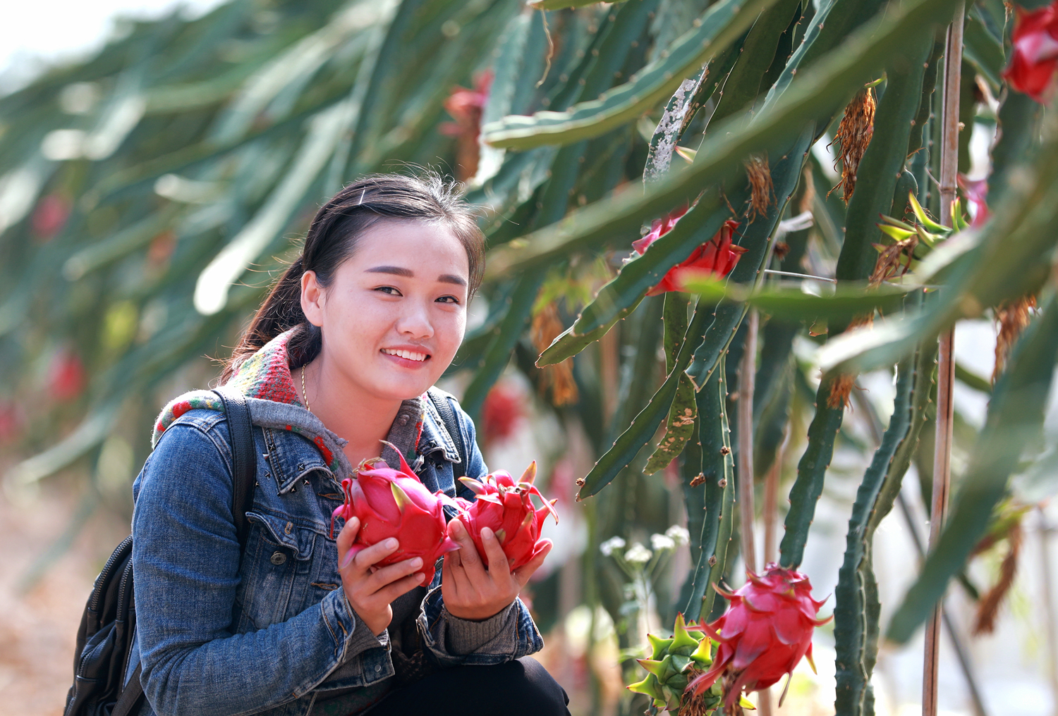 一排排整齐的大棚,在阳光照耀下波光鳞鳞,甚是壮观。大棚内,一米多高的火龙果树一一固定在大棚支架上,分列两侧,极像仙人掌;成熟的果实呈椭圆,颜色桃红色、紫红色,粉嘟嘟的,像一团燃烧的火球,又像一朵待放的玫瑰,远看还像一条“喷火的青龙”。
